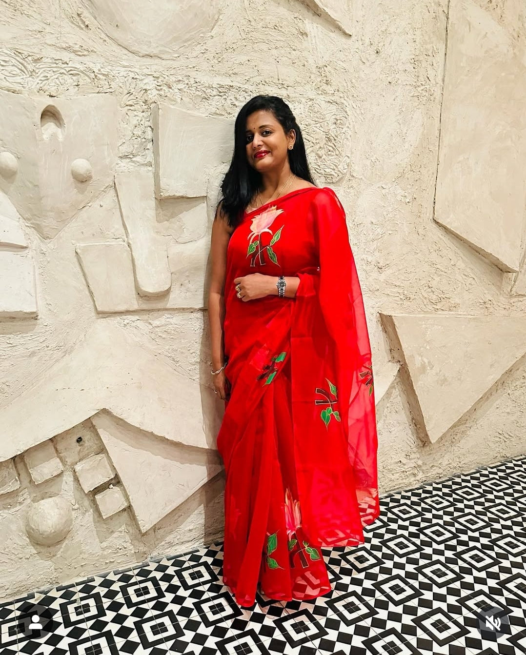 A delicate organza saree, sheer and feather-light,Hand-painted with graceful strokes of vibrant...