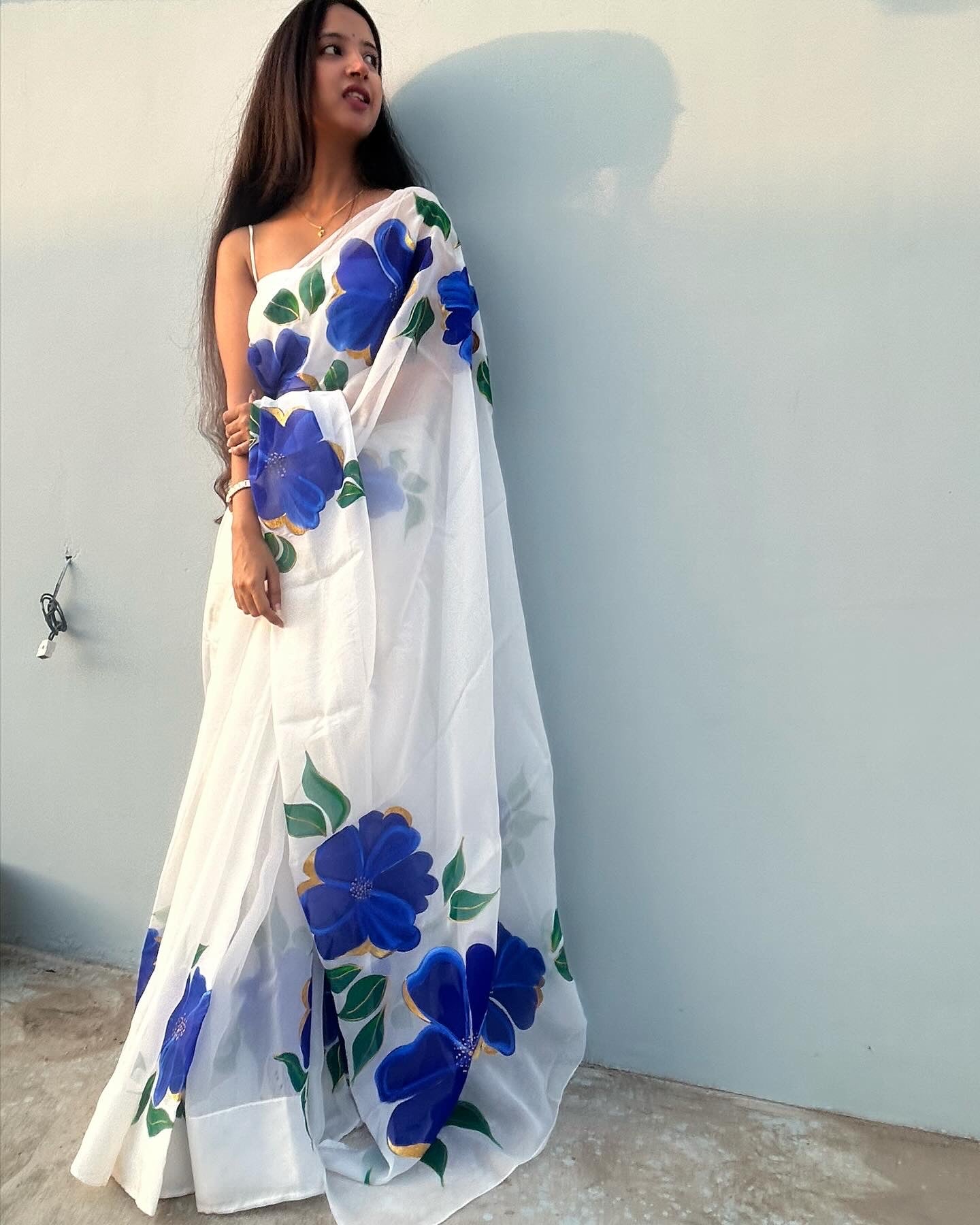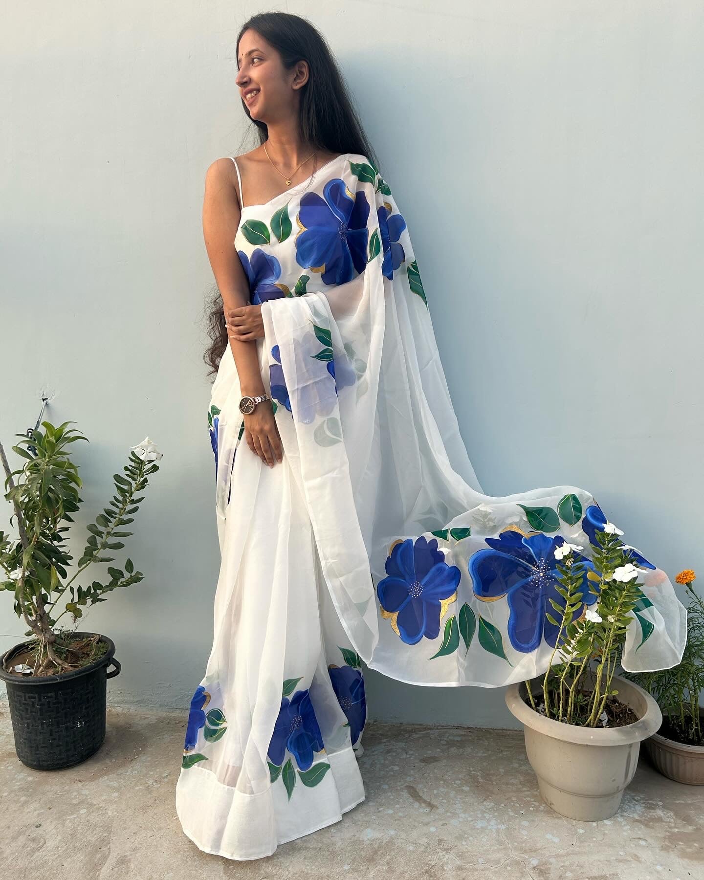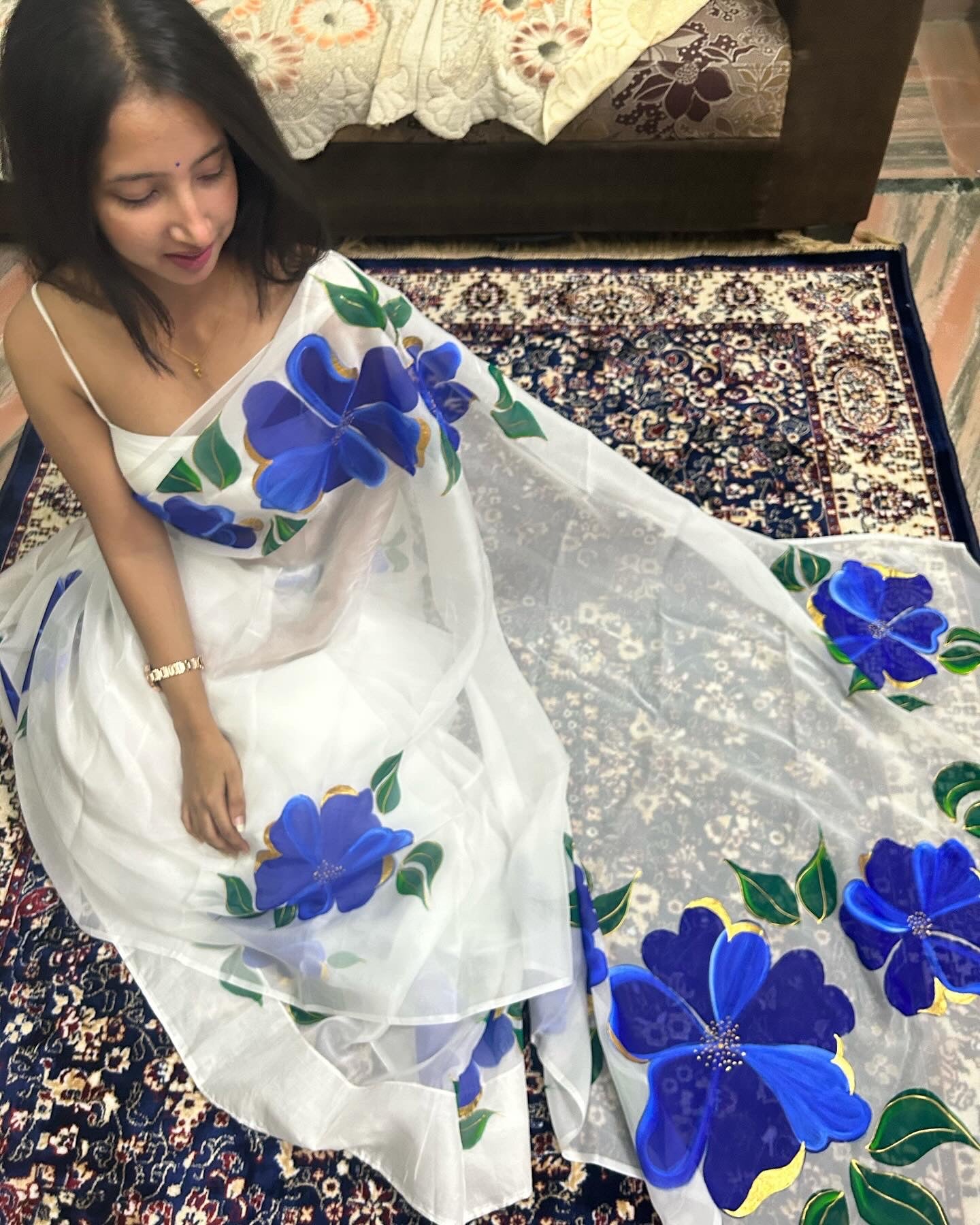 This exquisite viscous organza saree features delicate hand-painted Prussian blue flowers, beautifully outlined in shimmering gold. The intricate design is complemented by soft green leaves, creating a harmonious blend of elegance and nature. The sheer, lightweight fabric flows gracefully, adding a touch of sophistication and luxury, perfect for any special occasion.