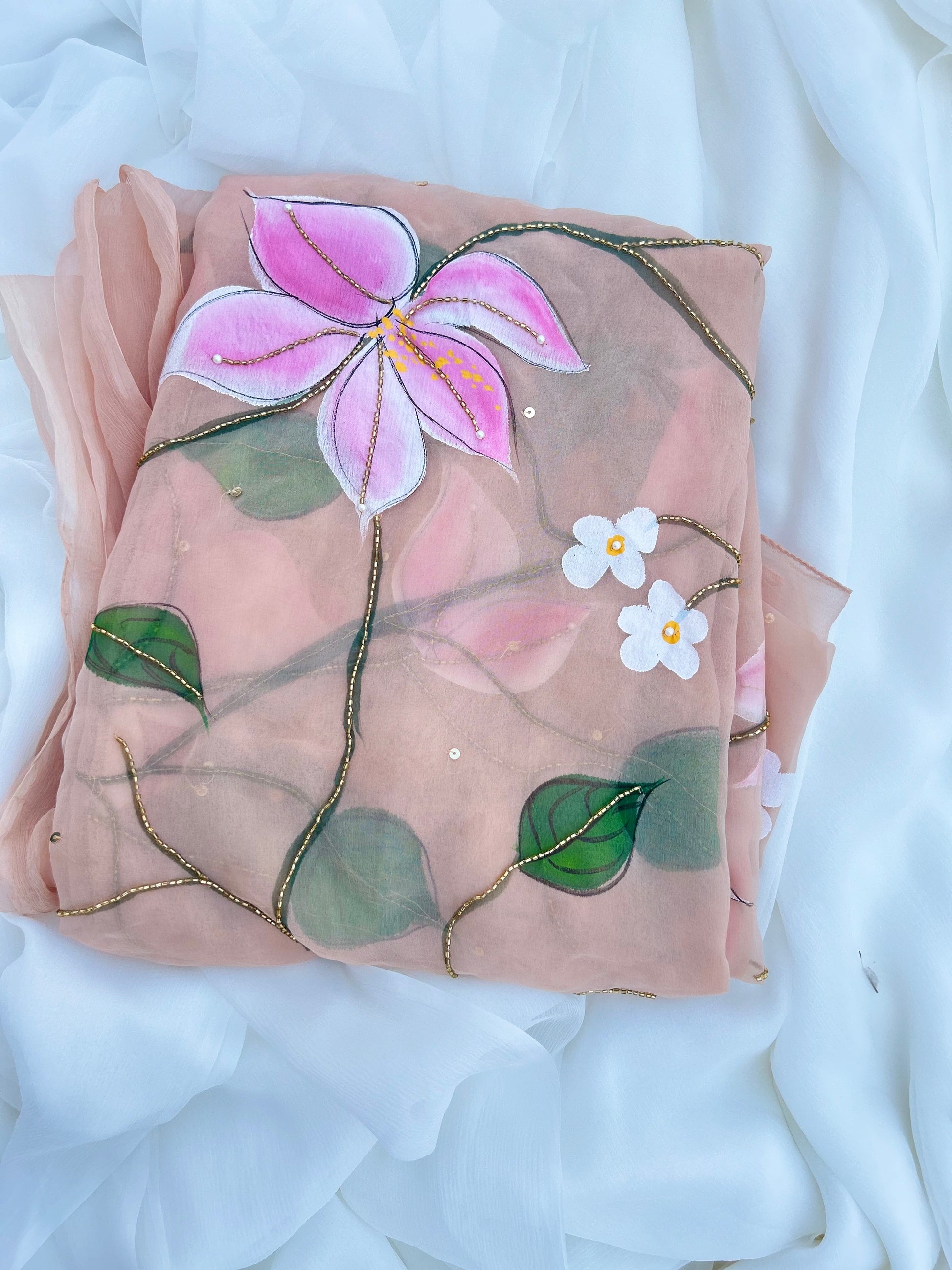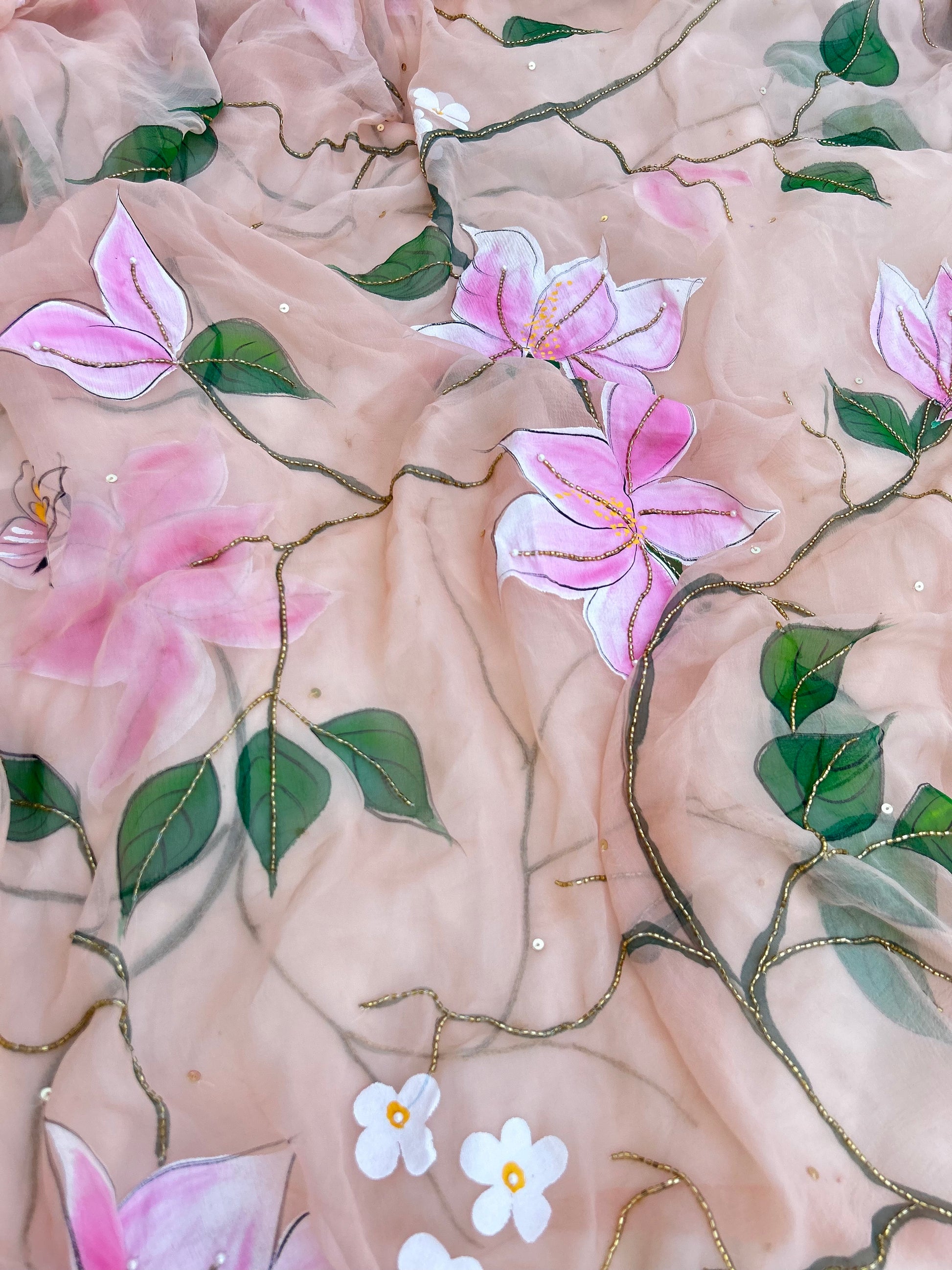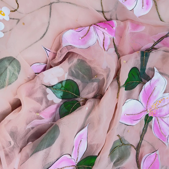 A beautiful hand-painted saree with elegant kardhana work all over the saree.