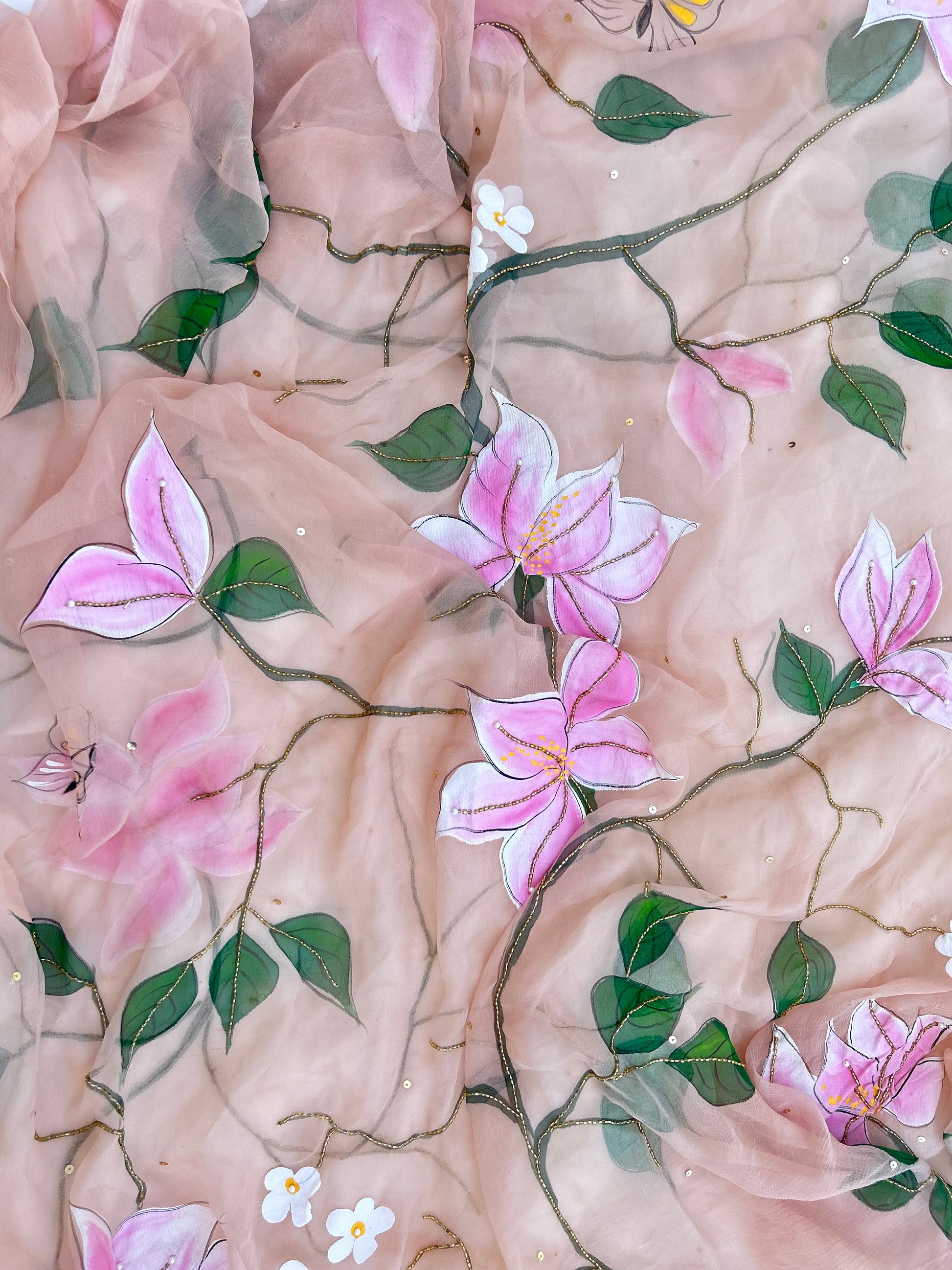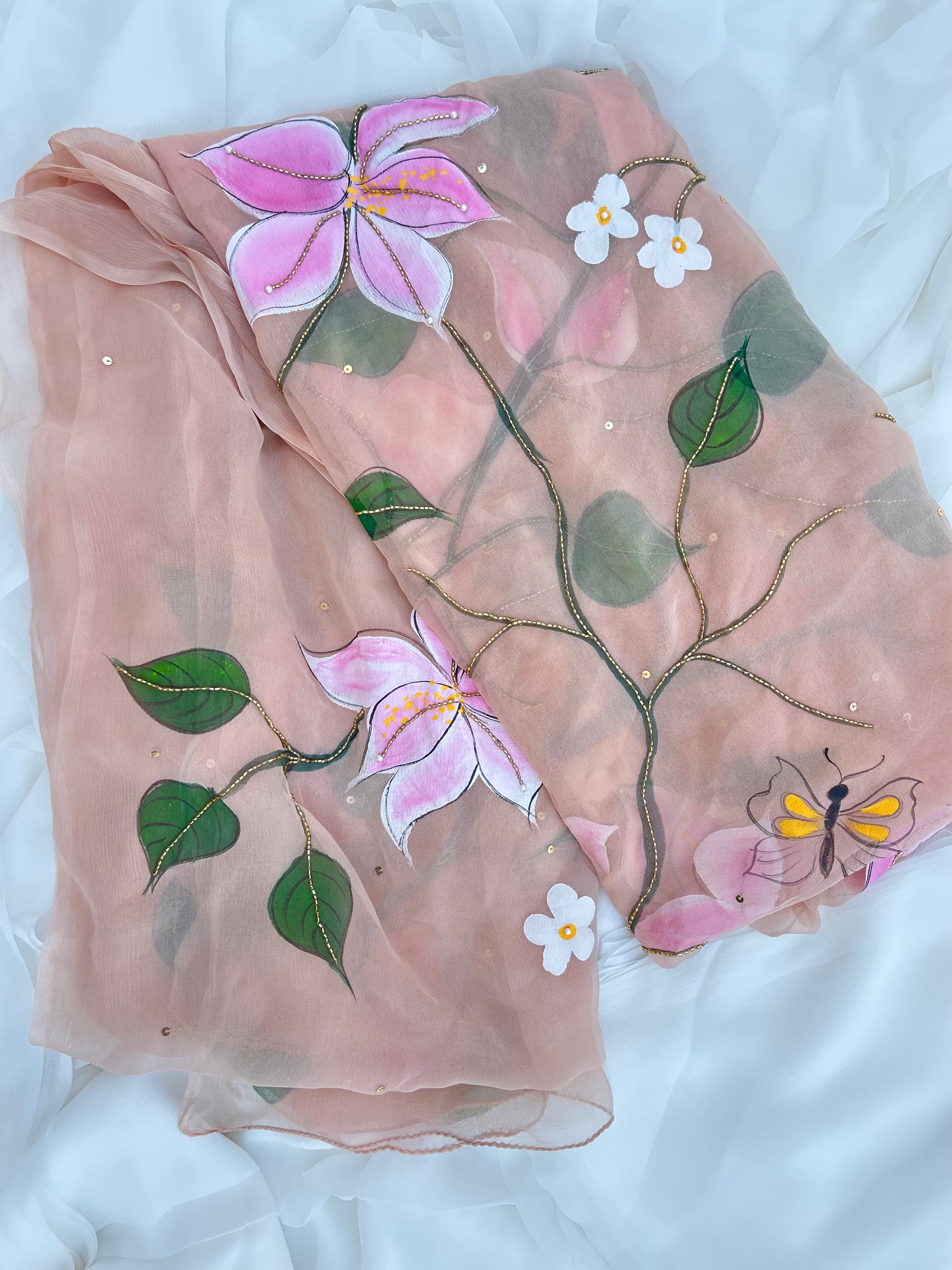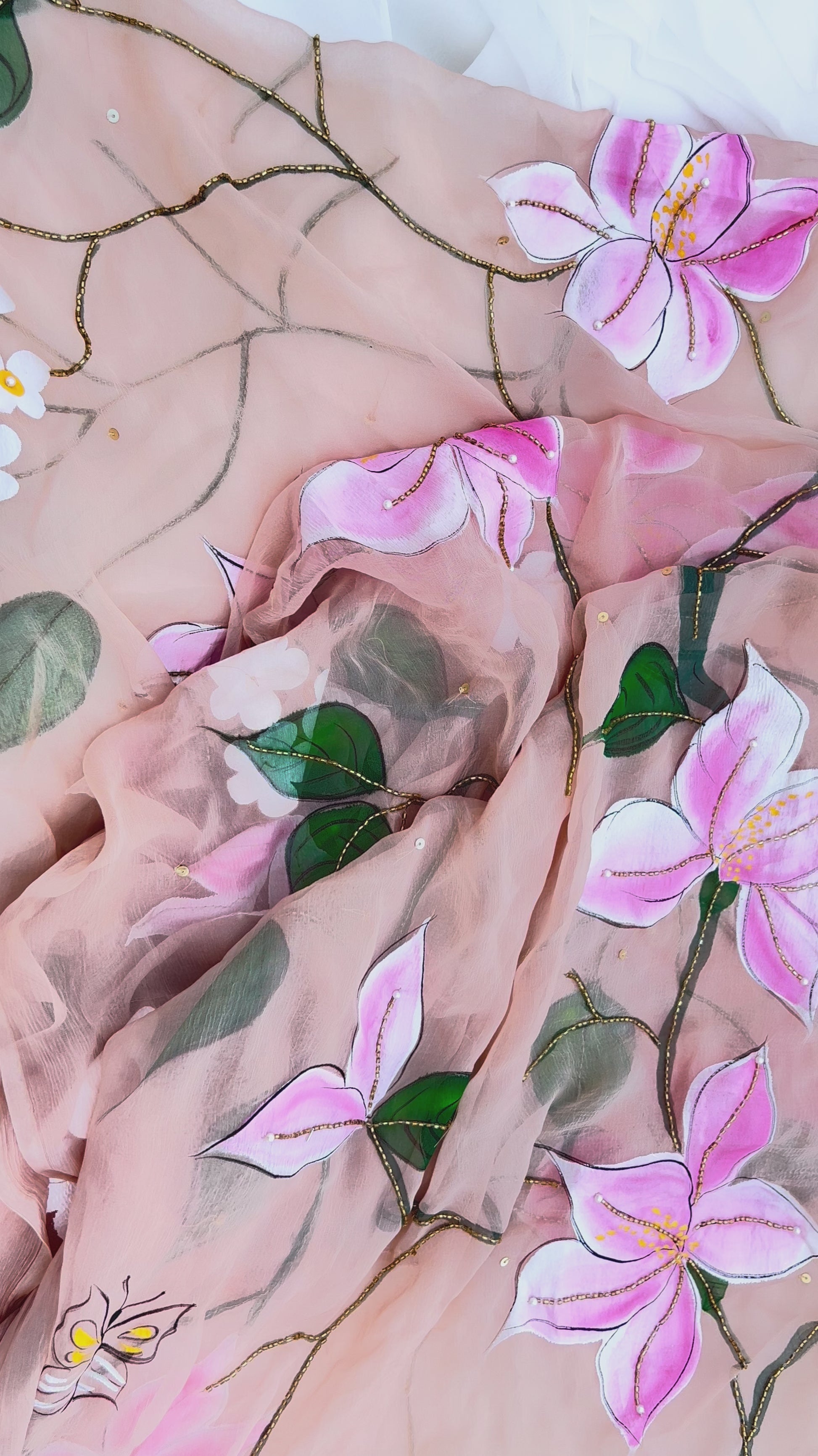 A beautiful hand-painted saree with elegant kardhana work all over the saree.